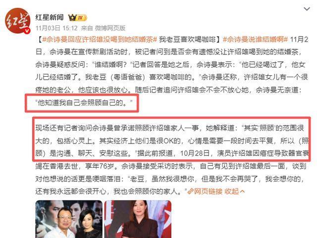 11月2号,佘诗曼还明确表示会照顾对方的家人,可见经过多年的相处,佘诗曼早已融入了许绍雄的家庭。