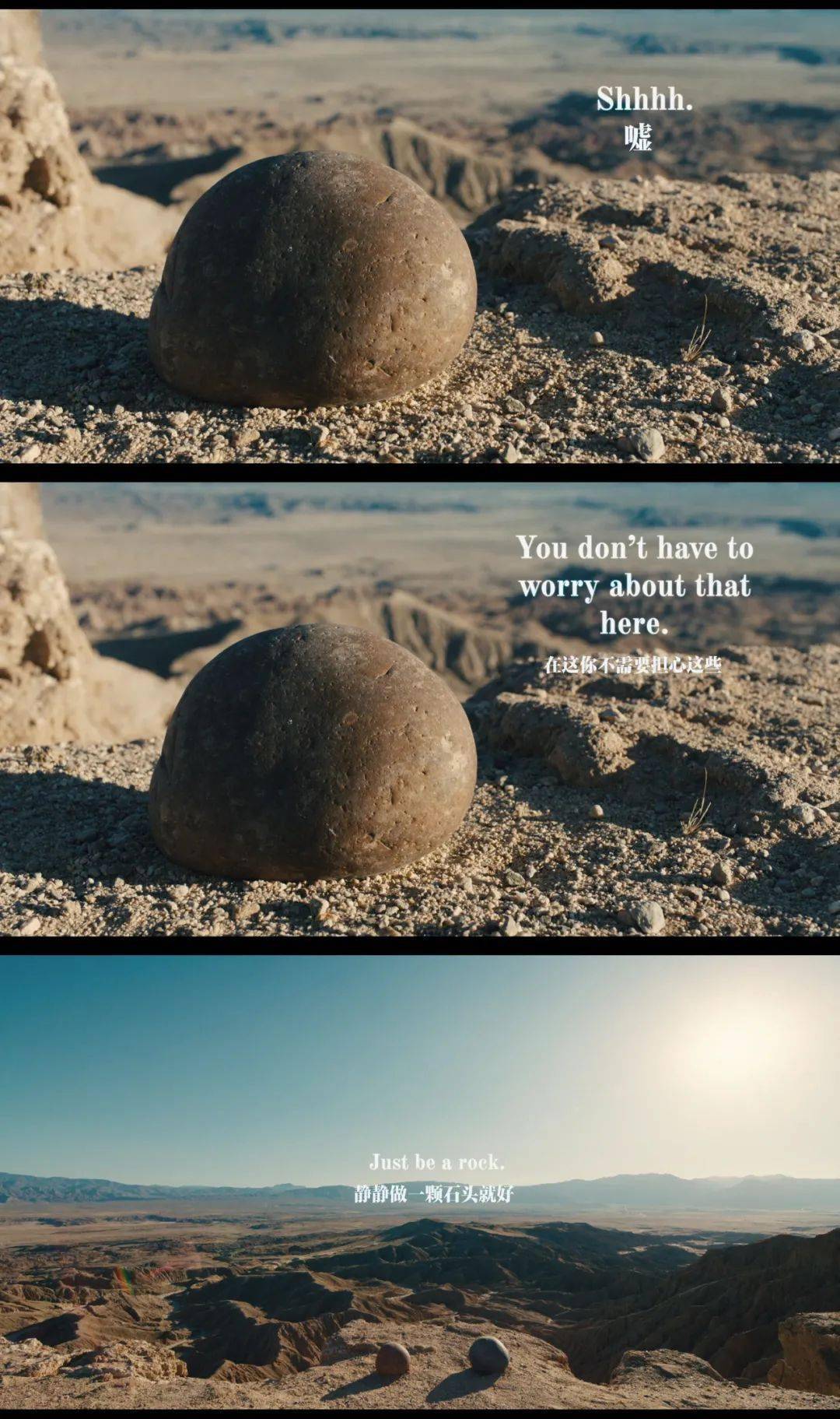 在这个平行宇宙中,“邪恶的大Boss”Joy和母亲Evelyn是两颗石头的形态,她们停止了追逐、打斗,只是平静地做着石头,望着这个世界。