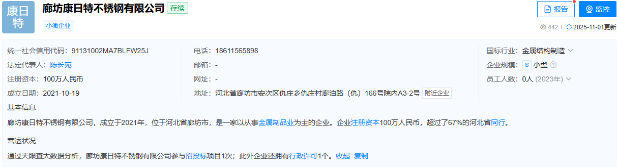 天眼查显示,廊坊康日特不锈钢有限公司成立于2021年,法定代表人为陈长苑,位于河北省廊坊市,注册资本100万人民币,是一家以从事金属制品为主的企业。