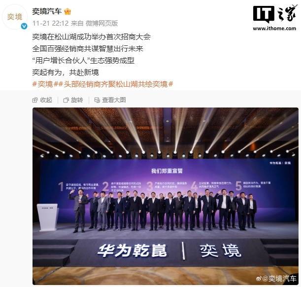 IT之家 11 月 23 日消息,在华为乾崑生态大会上,东风 × 华为深度合作首款品牌 —— 奕境正式官宣,首车将在明年亮相。11 月 21 日,奕境汽车宣布在松山湖成功举办首次招商大会。