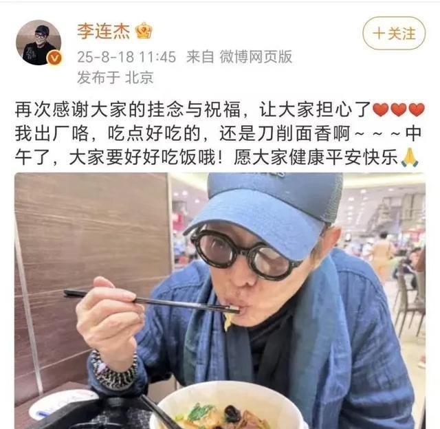 18日,李连杰在社交媒体上分享自己吃刀削面的照片报平安,他对大家的关心表示感谢,并宣布“出厂咯”。李连杰发布的视频内容显示,其目前已完成拆线。