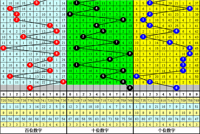大中小分析:在组选0-9号码分布图中,前10期小 号(0-2区段)出现8枚奖号,中号(3-6区段)出现7枚奖号,大号(7-9区段)出现15枚奖号,上期中号区域没有落号,本期注意小 号走冷,防0-2区段断区。